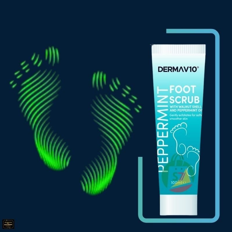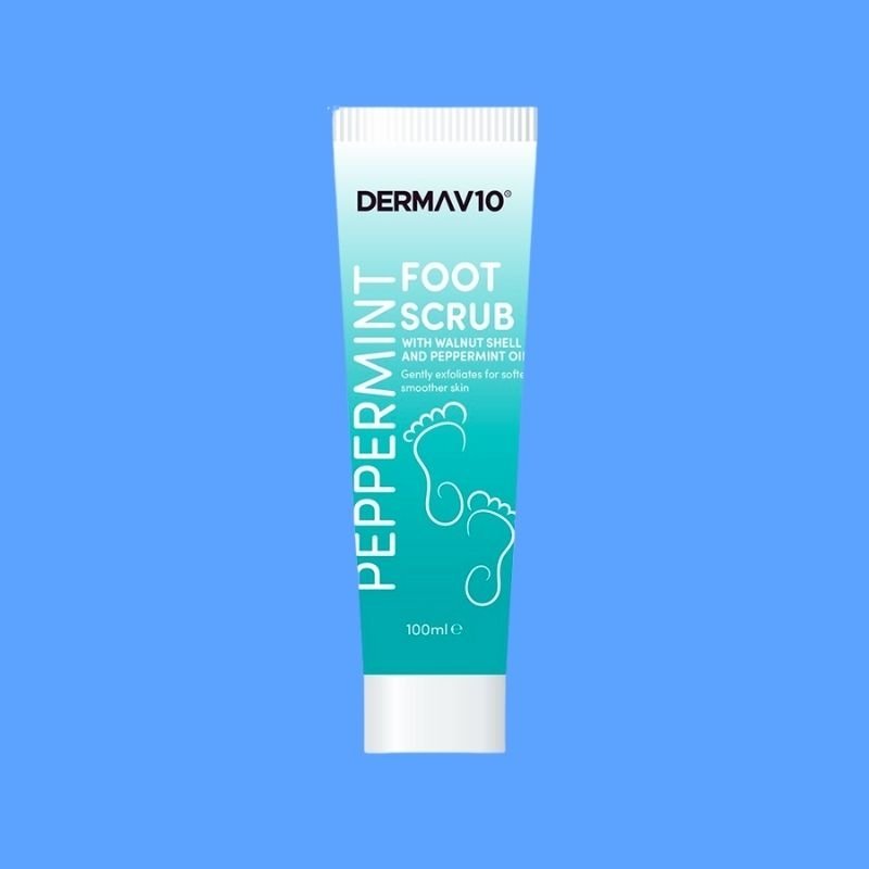 The scrub comes in a tube and has a grain-like form for manual exfoliation. It is designed to be massaged onto wet skin in a circular motion to remove dead skin cells and then rinsed off with warm water. The product is part of a range of foot care items from Derma V10, and for best results, it is recommended to be used 2-3 times a week, followed by their peppermint foot lotion.
