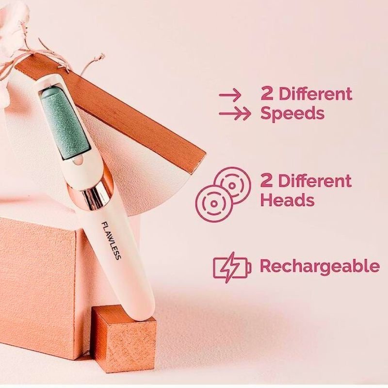 The Flawless Pedi is a streamlined, ergonomic device that allows users to perform a salon-quality pedicure safely at home. Its design features a long, easy-reach handle for a more natural back-and-forth motion, allowing users to treat heels, toes, sides, and balls of the feet with ease. The device is effective on dry skin and is a convenient, low-effort alternative to manual pumice stones or metal scrapers.