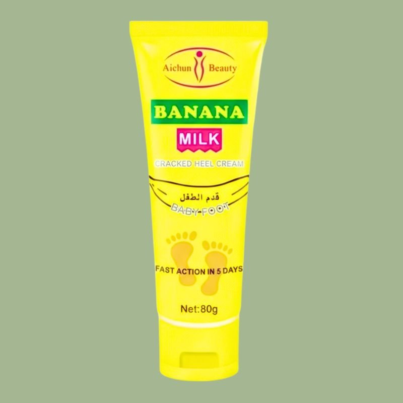 The cream is a rich, non-greasy formula that is easily absorbed into the skin. It targets tough, thickened skin on the legs and feet, providing deep hydration to soothe dryness and aid in the recovery of skin elasticity. The product also claims whitening properties, working to reduce dark spots and blemishes for a more even skin tone on the feet. It has a light banana scent.