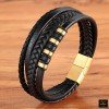 Classic Multi-layer Luxury Style Stainless Steel Men's Leather Bracelet Hand-woven - Black and Gold-23cm.