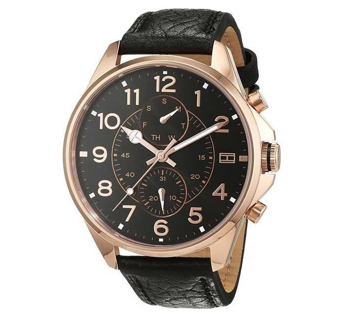 Tommy Hilfiger Watch for Men – 1791273 is a dark dial and matching leather strap embolden the sporty look of Tommy Hilfiger's chronograph watch cast in gleaming rose gold-tone. This timeless creation looks appealing.