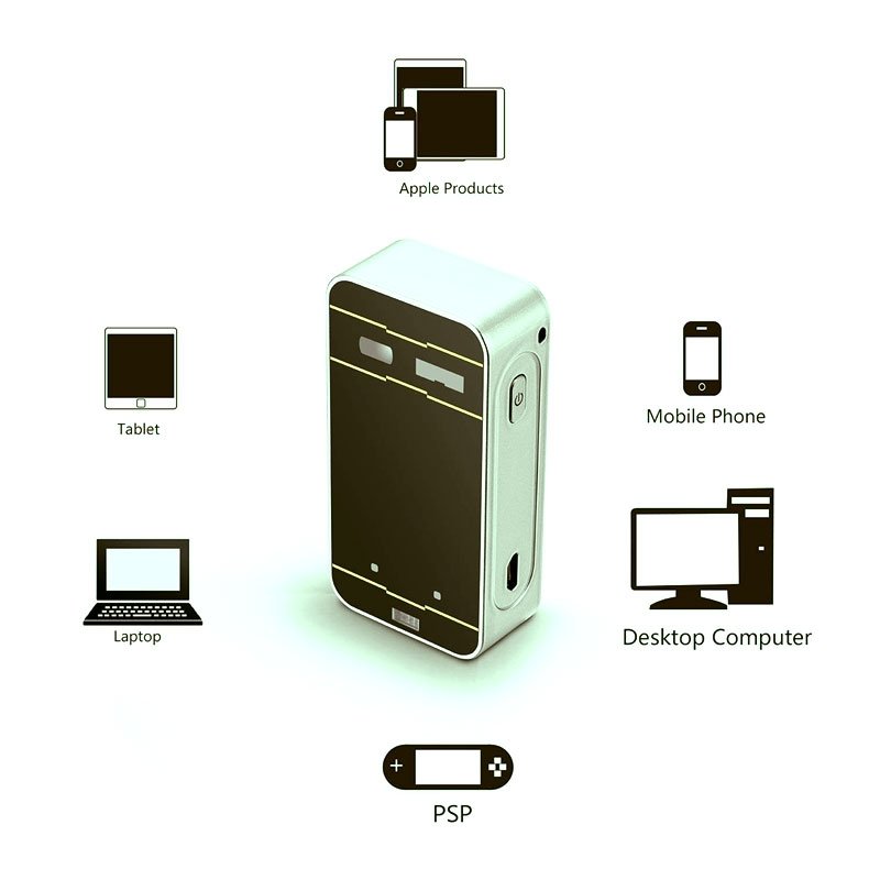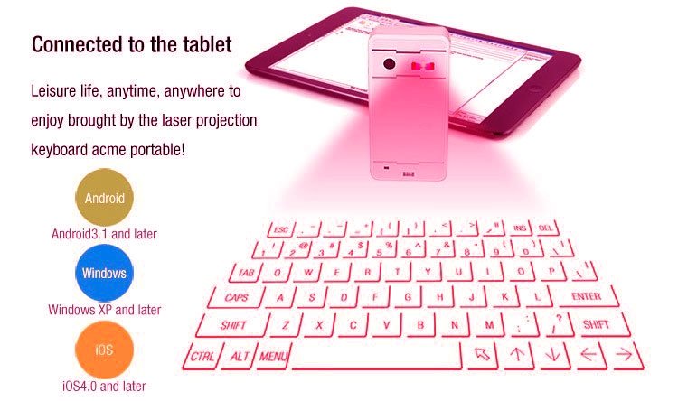 This projection keyboard will work via Bluetooth HID. connection to main devices, like Tablet PC, Smartphone, Desktop PC and Video game . As a new input device, using the built-in infrared laser transmitter to project the standard keyboard on the working surface,